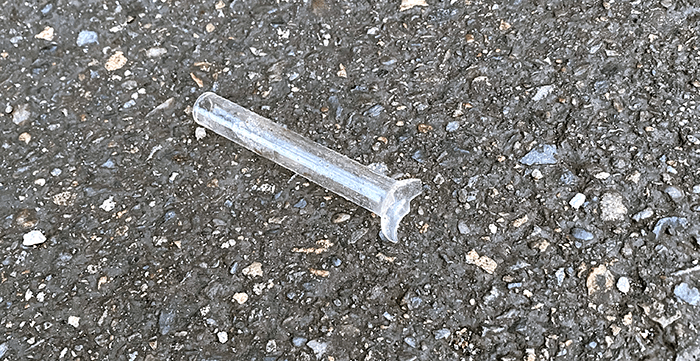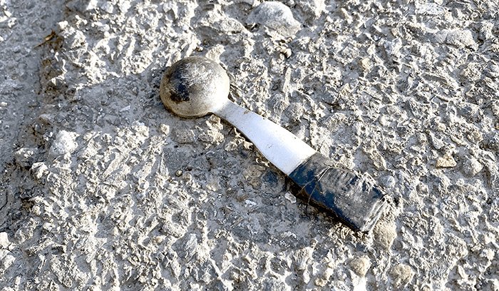 This is a druggie’s crack spoon with burn marks on the bottom and tape on the handle. Wonder how many times he awoke in the morning wondering why he had burns on his fingers before putting the tape on the handle?