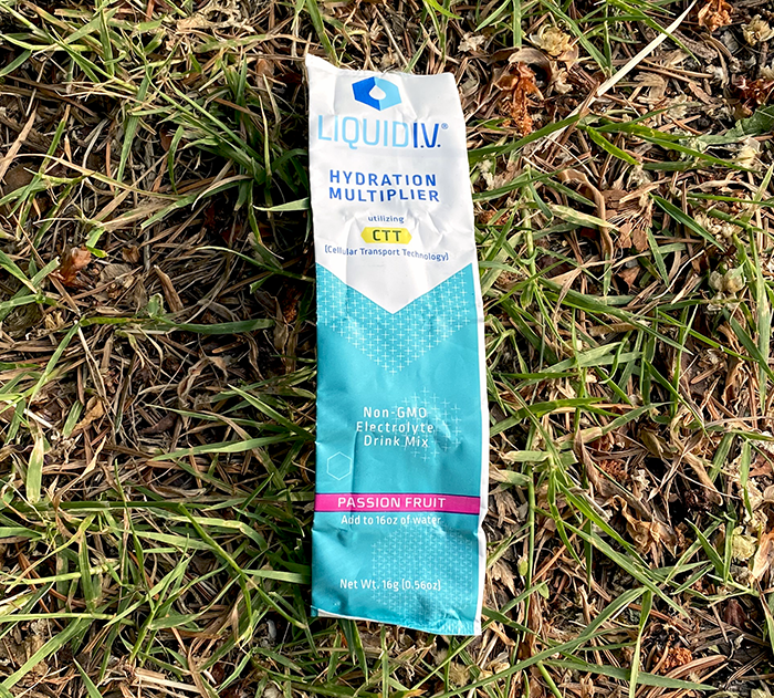 Liquid I.V. Hydration Multiplier with Cellular Transport Technology, passion fruit flavor. They had us going until the “passion fruit.”