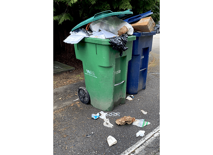 These containers are always overflowing, and the crows take full [get it?] advantage. Yes, we picked it up and put it back in the bins.