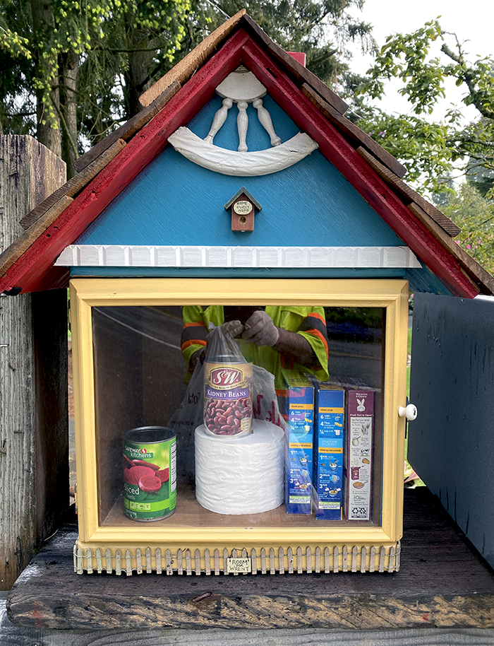 We first saw it yesterday and did not think to take a photo, but it did have some books in it. It is very well made. The sign above says “Home Tweet Home” and the one below states “Room to Wrent.” Nice job. Today, a roll of toilet paper appeared. No, we didn’t take anything, but we could have added Mike’s empty gift card.
