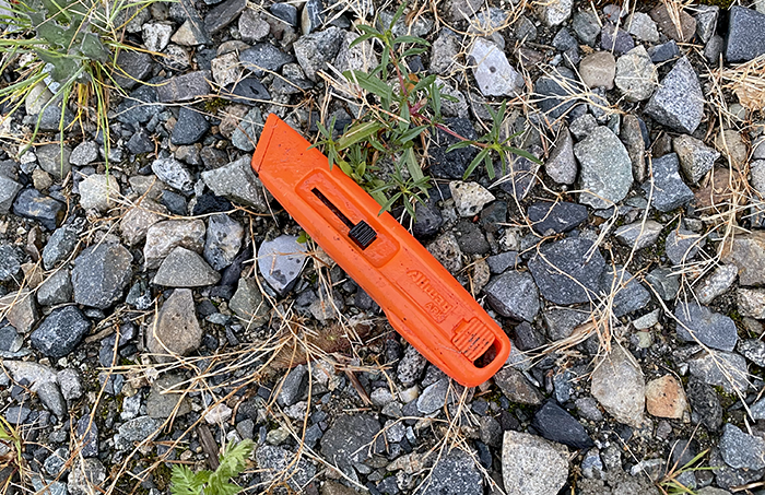 A plastic utility knife with one rusty blade. Useless. Later, we found another tool.