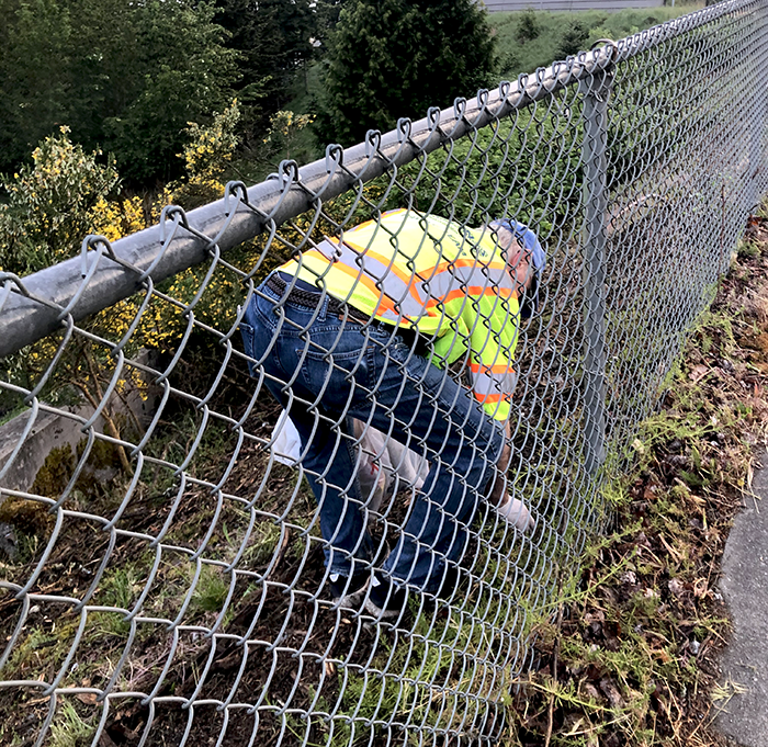The mowers had mowed over the fence at the freeway uncovering a lot of trash. This area is partitioned off by a chain-link fence and the freeway barriers, so Chuck hopped over the barrier. Well, hopping is a pretty strong word, it was more like slithered.