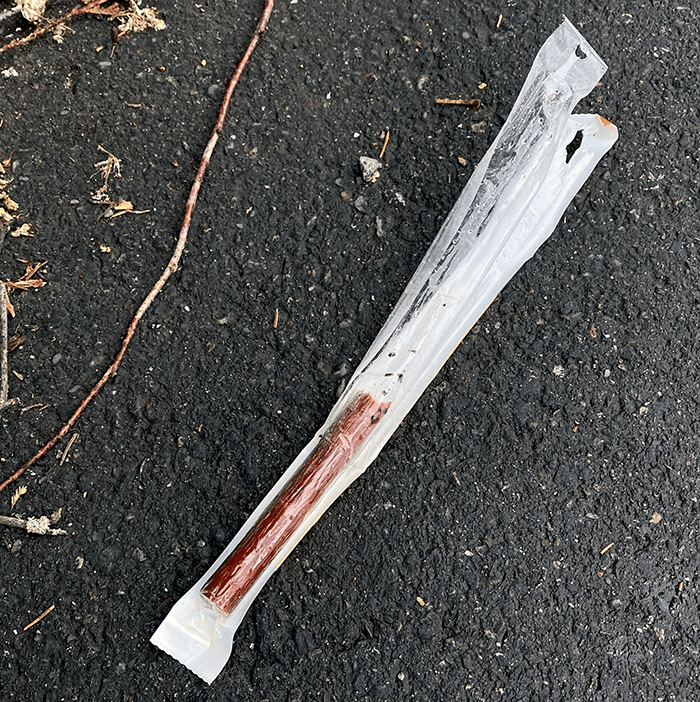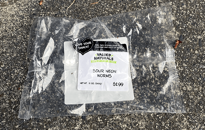 Okay, this is a candy wrapper. We’ve been seeing a lot of fishing boats on the road since fishing has been unlocked, so we thought these might be fishing bait. Worms? Good. Neon? Yep, fish seem attracted to bright things. Sour? Not so sure.