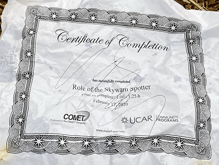 This was interesting. A completion certificate for the “Role of the Skywarn Spotter.” This is actually a National Weather Service Volunteer Program to warn about severe weather.