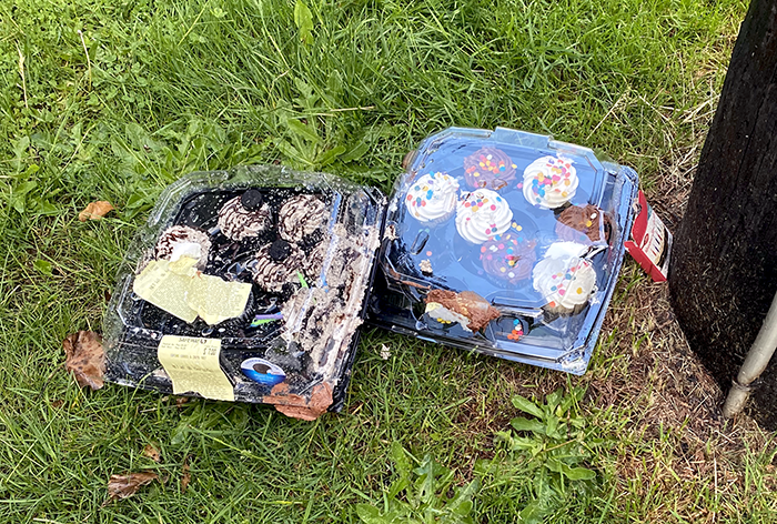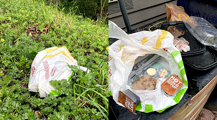 Yesterday, we found the two McDonalds teacups with the certificate and discussed that it might be the McLitterers but we missed the bag. Today, we found the bag with the two clean platters, unused utensils and unopened butter and syrup.