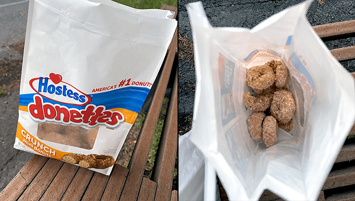 At the bus stop by the 7-Eleven, was a donut bag on the bench.