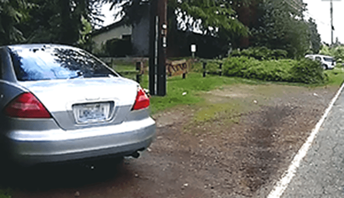 The couple in the car are awakened by two strangers with gloves and vests cleaning up the area. The couple in the car make a hasty retreat leaving their license plate number for future blackmail purposes.