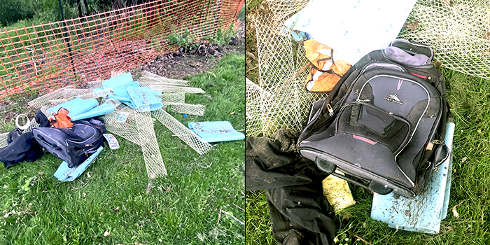 Nice work! It included, among other things, a license plate, a roller bag, a pair of work pants and a safety vest. We eyed the vest, but it was in poor condition. We’ll see how long it stays there before the city cleans it up.