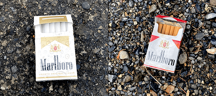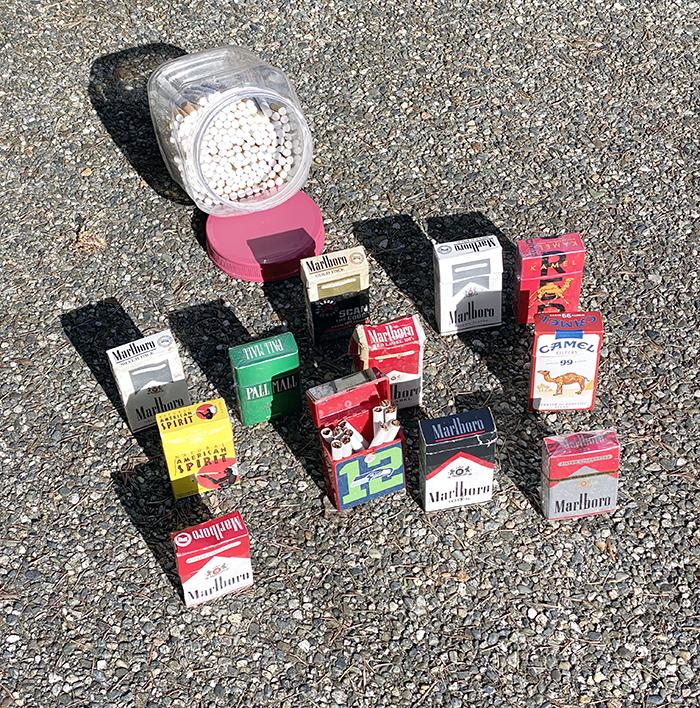 We found two almost-full boxes of cigarettes, one on Riverside Drive and one on the Freeway off ramp.