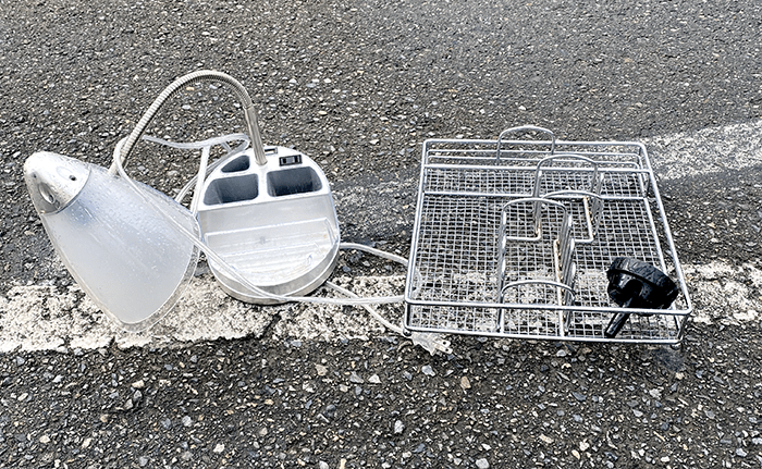 A desk lamp and a silverware organizer?? If anyone out there can shine a light on this situation, let us know.