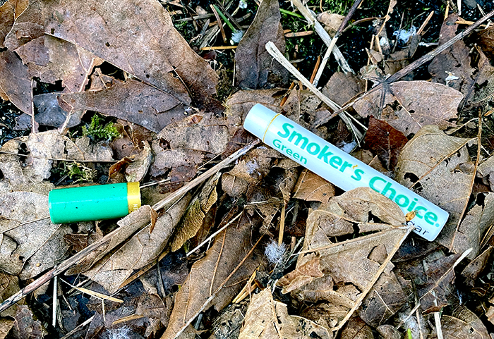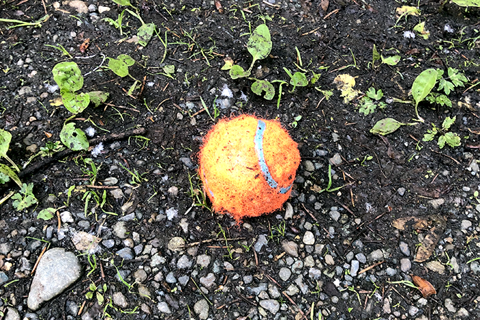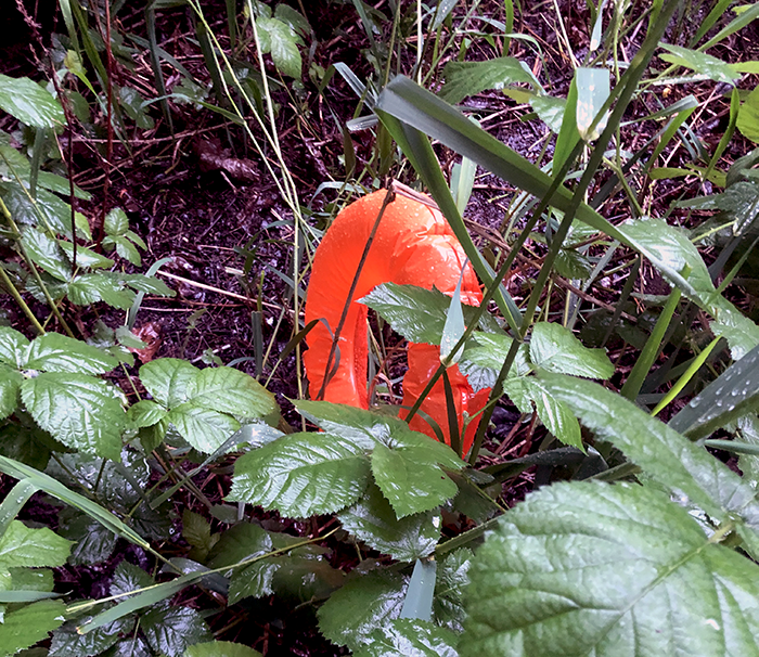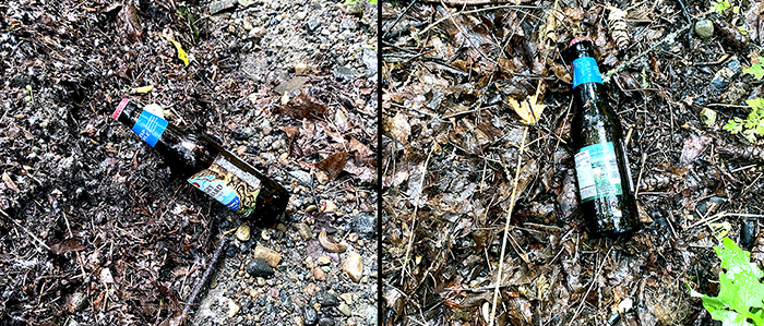 Actually we found Angry Orchard bottles and Corona bottles, all with their caps pressed back on. The Corona bottles were partially hidden, so we may have missed them on previous walks. Or, we may be dealing with a split-personality drinker.