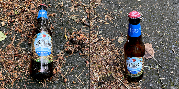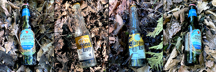 For a while we’ve been finding empty Corona beer bottles on Norway Hill with the caps pressed back on. They have switched to Angry Orchard Crisp Apple hard cider.