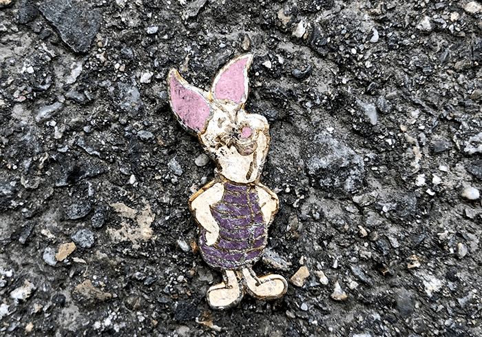 At least we think it is a Piglet pin. Fifteen bucks on eBay. Although, this one was run over a few times and the face was unrecognizable so we couldn’t make a positive ID.