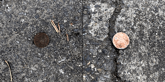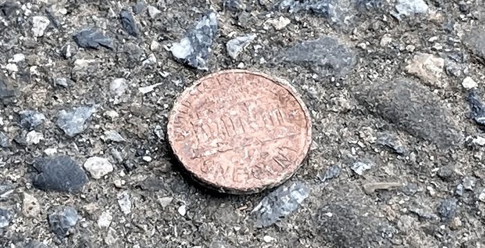 A beat-up penny on the northbound freeway off-ramp. Hey, on our salary, this is a treasure.