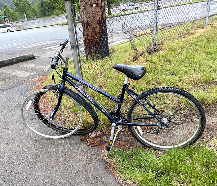 It has a tire issue and is a little beat up. But it has disc brakes. Neither of our mountain bikes have disc breaks. But our bikes are about thirty years old and haven’t been ridden by us for at least fifteen years. Perhaps we should dump them here also.