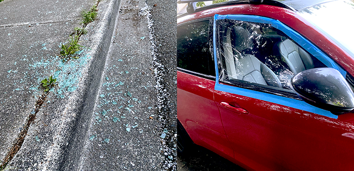 Then, about fifty feet farther down a car with a freshly-taped window. The news has been warning that car theft and car prowls are up due to people leaving their cars on the street for long periods of time.