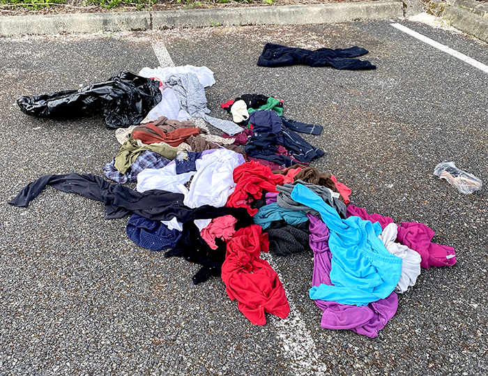 There were a lot of nice, fairly-clean clothes on the ground. There was also a large plastic bag. We stuffed the clothes into the bag and came back later with the car to pick it up. In all there were a lot of tops, one pair of pants and one pair of shoes. Not a very balanced wardrobe. No problem. Goodwill has a lot of shoes.