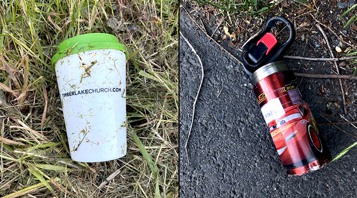 A reusable cup from Timberlake Church. Well, it could have been reused if they hadn’t tossed out the window. Also Rafael’s “Cars” water bottle. It’s also designed to be reused, Rafael. But I guess that argument doesn’t carry water anymore.
