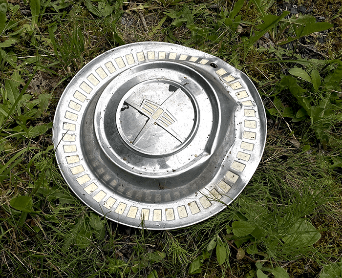 We have been walking past this hubcap for several weeks on our Saturday walks. It was wedged in the ground behind the chain-link fence by the freeway. Today, we tried lifting the bottom of the fence and successfully slid it out. It appears to be a 1960’s or 1970’s era Lincoln hubcap, but we couldn’t find a match with Google.