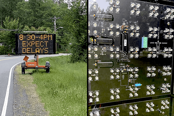 These signs warning of road work look pretty mundane from afar. But today, we stopped by one to transfer some trash between bags. Don’t ask. Up close, the signs are circuit boards with LEDs, capacitors and IC chips. Interesting. Well, not to Janet.