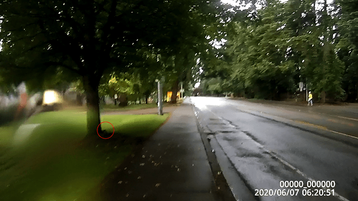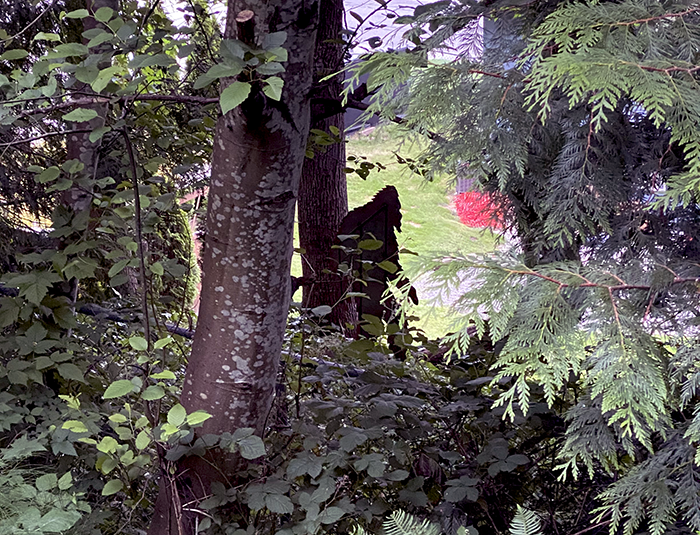 On Juanita-Woodinville Way, we spotted a squirrel’s tail as the squirrel climbed down a tree trunk. As we approached, the squirrel peaked around the tree.