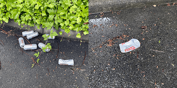 At the park-and-ride where we were asked not to pick up trash, the Coors cans we left on our Saturday walk were still there.