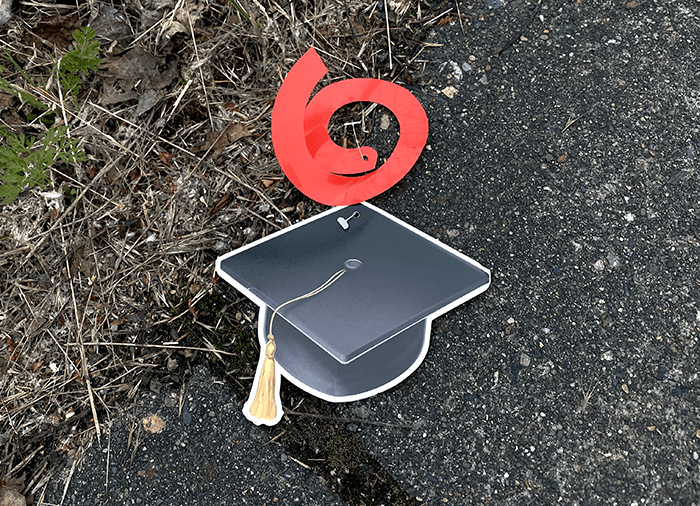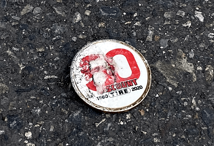 Discount Tires, “60 Years, 1960 [to] 2020.” It was run over. Wonder if it caused a flat tire?