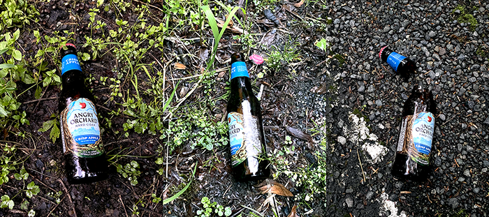 Seven Angry Orchard bottles. The two Corona bottles were down a bank under a tree, so have probably been there a while, probably sleeper cells. This is a formidable attack. We’ll see if they can keep it up.
