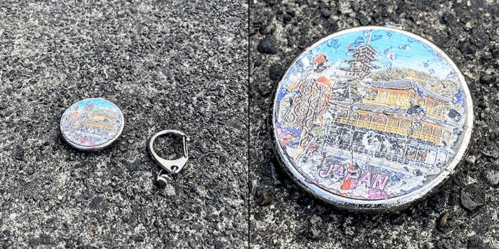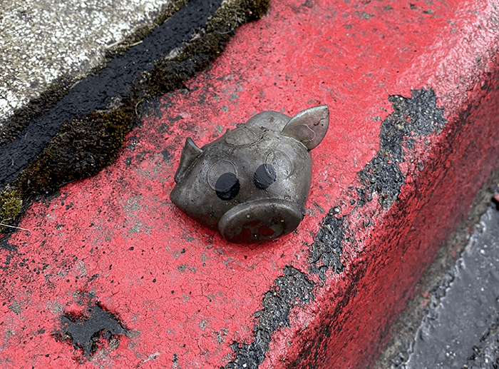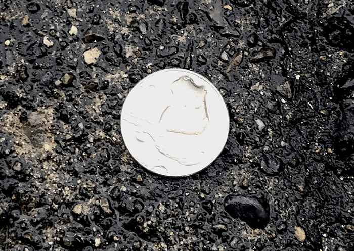 A beat-up dime. Yesterday, we found a nickel and today a dime. Is someone trying to nickel-dime us here? If so, let’s have a nickel-dime-quarter next.