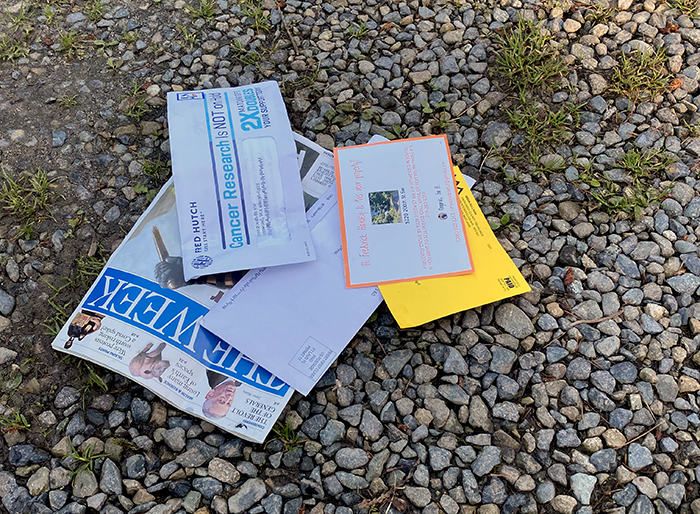 After this photo was taken, more was found along the route. I ended up with a shopping bag full. All from the same address and mostly junk mail. Ah, Summer Solstice marks the start of mail theft season.