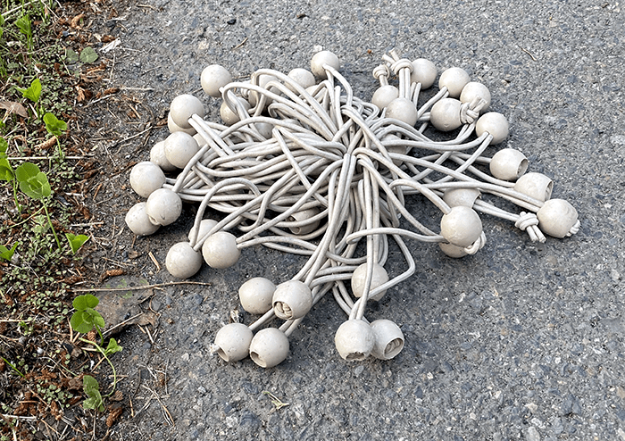 At first we didn’t know what it was, but later as we sat enjoying a socially-distanced beer at the Hop and Hound’s tented outdoor space, we saw them. They are called Bungee Balls and are for uses like tying tents and tarps, to support poles. Do they work on small hyperactive dogs? Inquiring minds want to know.