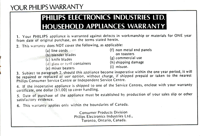 The mixer weighed about two pounds. The shipping and handling charge was $1.00, so about three cents an ounce. According to Wikipedia, the package postage rates were $0.03 per ounce from 1932 to 1958 when it jumped to $0.04. But the warranty was only a year, so the mixer probably quit working so the owner tossed the instructions.
