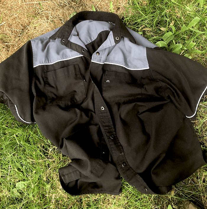 A McDonalds server’s shirt. We’re retired, we can use this. We can become the a Assistant to the Assistant Manager. Hey, better than being the greeter at Walmart.