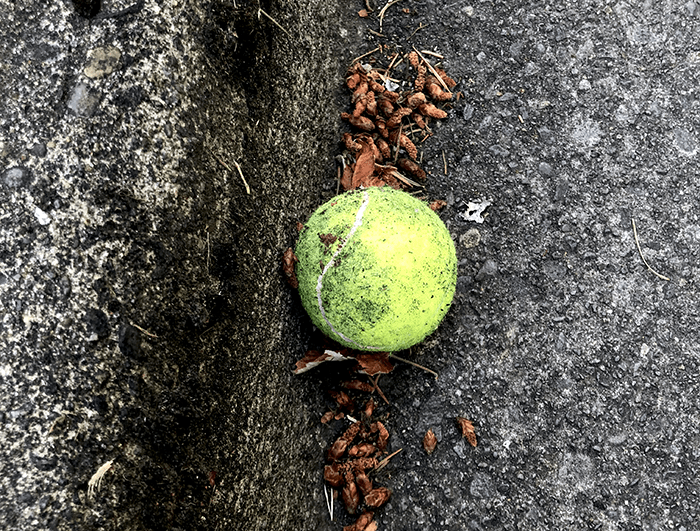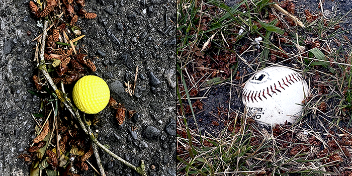 A small yellow one like we’ve found before. Also, a baseball half-buried by the side of the freeway onramp. Both are in our ball collection.