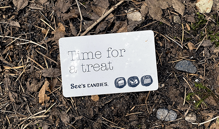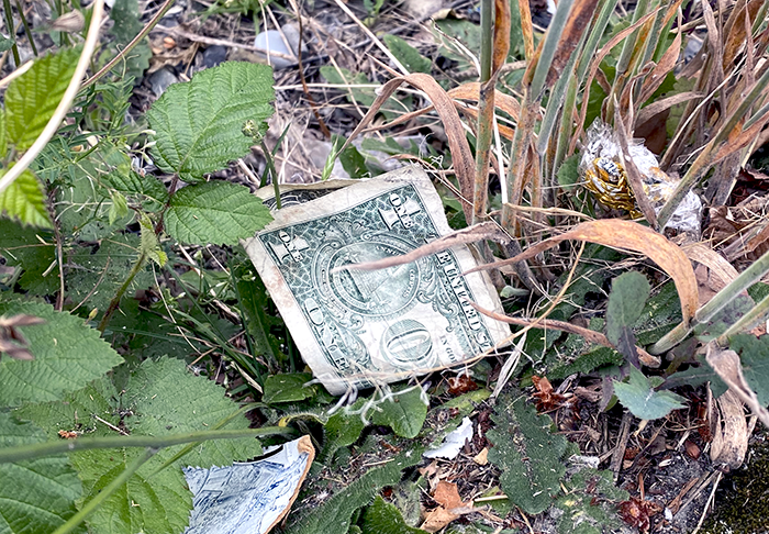 We checked. It has five dollars on it! So our total take today was $6.02. And that’s not counting the condom.