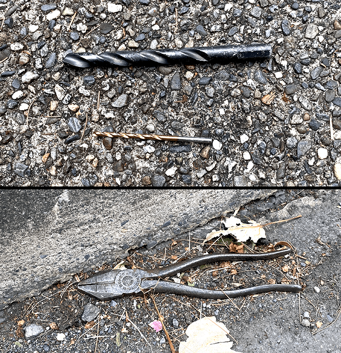 More drill bits near the freeway onramp. We also found out why. There was a smashed Milwaukee drill bit case. The Lineman pliers are H. Boker model 5612 and are for sale on eBay for $10 to $20. They don’t say how many sell for that price.