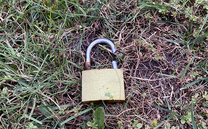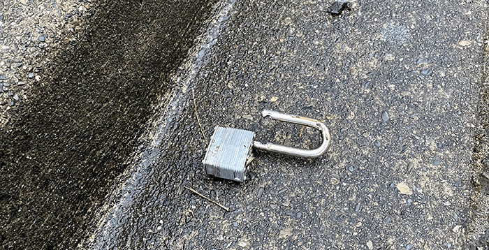 Unlike most locks we find, this one was not lost. It had been cut and tossed. In this case, a key would be of no use.