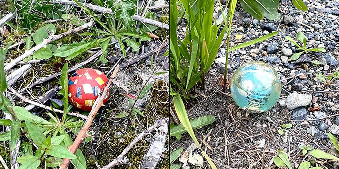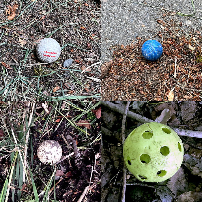 The softball-sized green whiffle ball was near a fenced yard so we tossed it back. The two golf balls were in the rough, so we improved their lie and are now in our ball collection. The other blue ball may be the remains of a cat toy. It didn’t bounce at all, so was no fun to us.