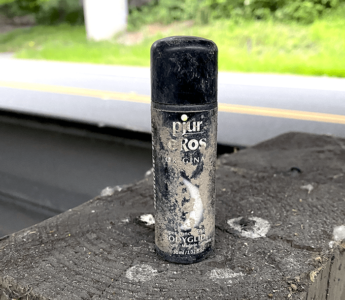 Under the freeway, we find a lot of things discarded from the passing cars above. Today we found some personal lubricant.