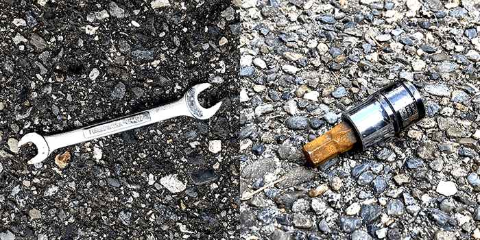 A 3/8ths-7/16ths Craftsman wrench in pristine condition and a 9mm hex-socket in not-so-pristine condition. We’re not picky, they both went into our collection.
