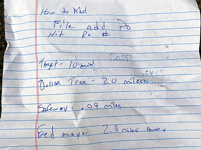 File/Add PO. Enter PO number. Seems pretty straight forward. Then there are some distances to various stores. We should be able to triangulate on these distances to determine where he was located when he tossed this trash. Okay. 0.09 miles from Safeway. That kind of gives it away.