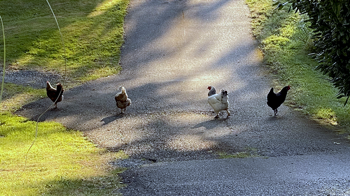 These were escaped chickens on Norway Hill. They were more chicken of us then us of them. We hope they were not crows in chicken costumes.