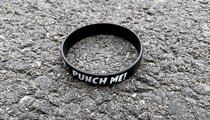It was labelled “Punch Me!” and “Hit Me!” Why would anybody even think about wearing this? Maybe it’s a free promo bracelet from a sadomasochism club? List of universities with BDSM clubs. Things have sure changed since we went to college.