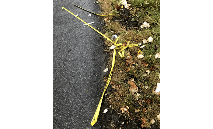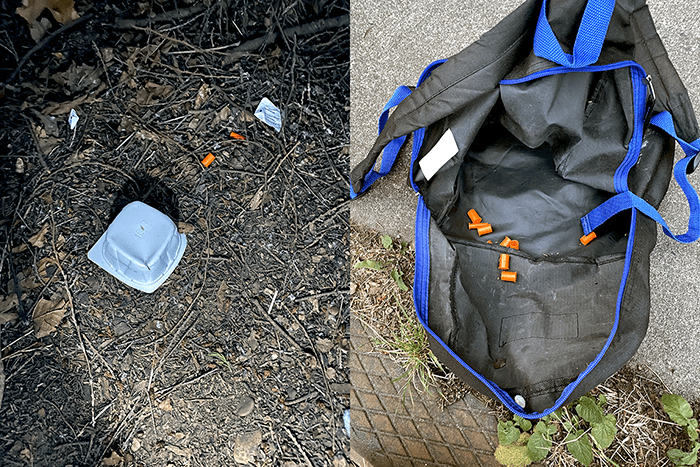 There was also a small duffle bag and two syringe caps on the ground.