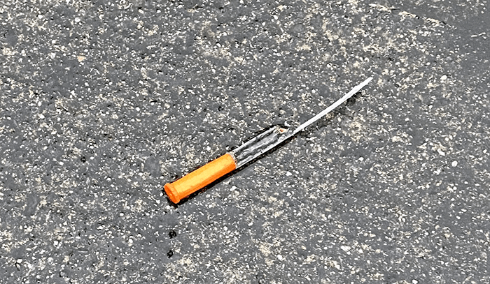 We picked up a smashed syringe with the cap still on the business end.