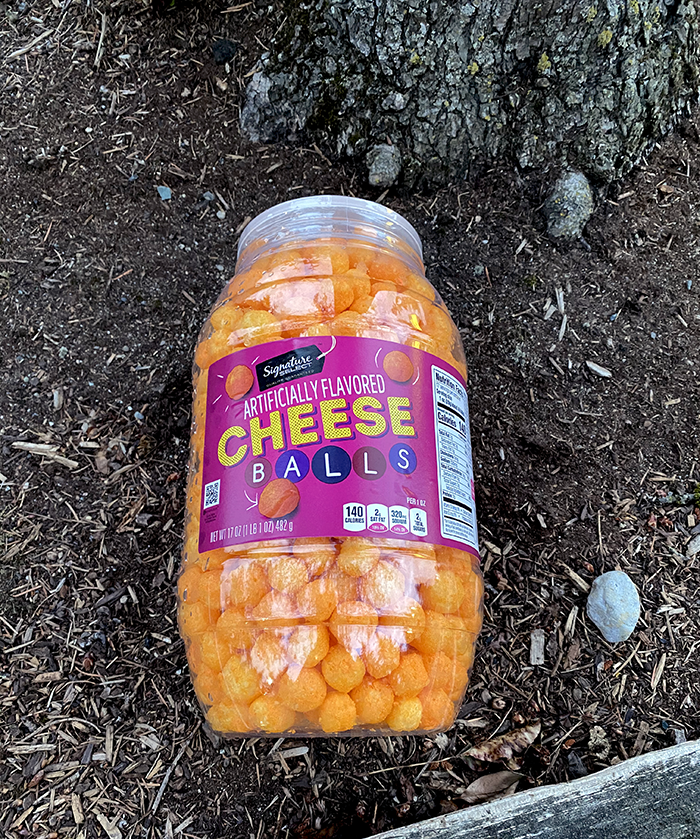 We found a sealed pound jar of Cheese Balls, and artificially flavored. None of that musty real-cheese smell for us. No, we don’t trust these. We left it by a Papa John’s Pizza Store door. Perhaps one of their drivers will want it. They’re called Guinea pigs.