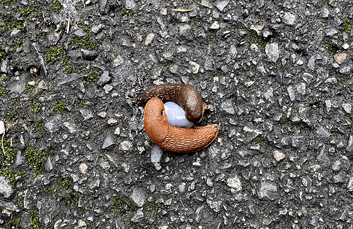 But the theme today was wildlife. We’ve seen deer, raccoons, bob cats and other animals on our walk. Today, we found two slugs in a life-and-death struggle over some unidentified something.