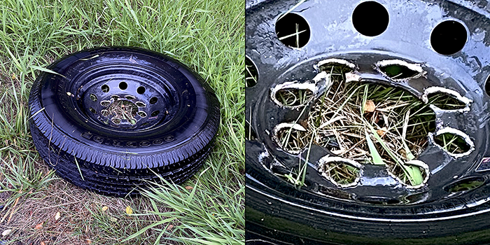 In the same vein, on our walks, we’ve picked up a lot of lost lug nuts. We pulled this wheel out of the ditch.