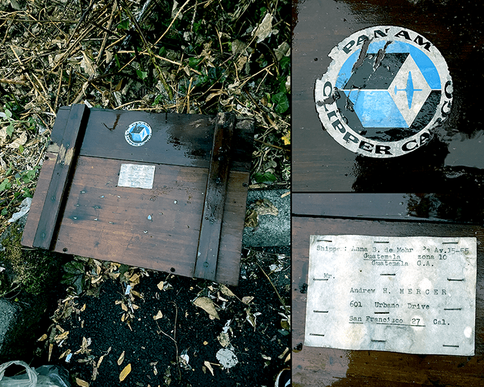 First, the Pan Am Clipper Cargo sticker shows its old. Pan Am went out of business in 1991. However, this logo shows a prop plane, not a swept-wing jet liner. Second, the address tag shows a delivery address as “San Francisco 27 Cal.” The 27 is a postal zone code that was implemented in 1943 and replaced in 1963 by the zip code system. So this box was probably shipped in that range.