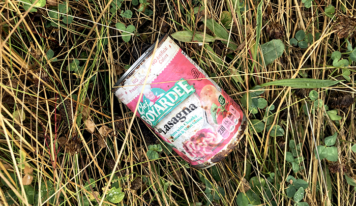 On the freeway off ramp where a guy regularly plays a guitar, someone gave him a can of Lasagna.